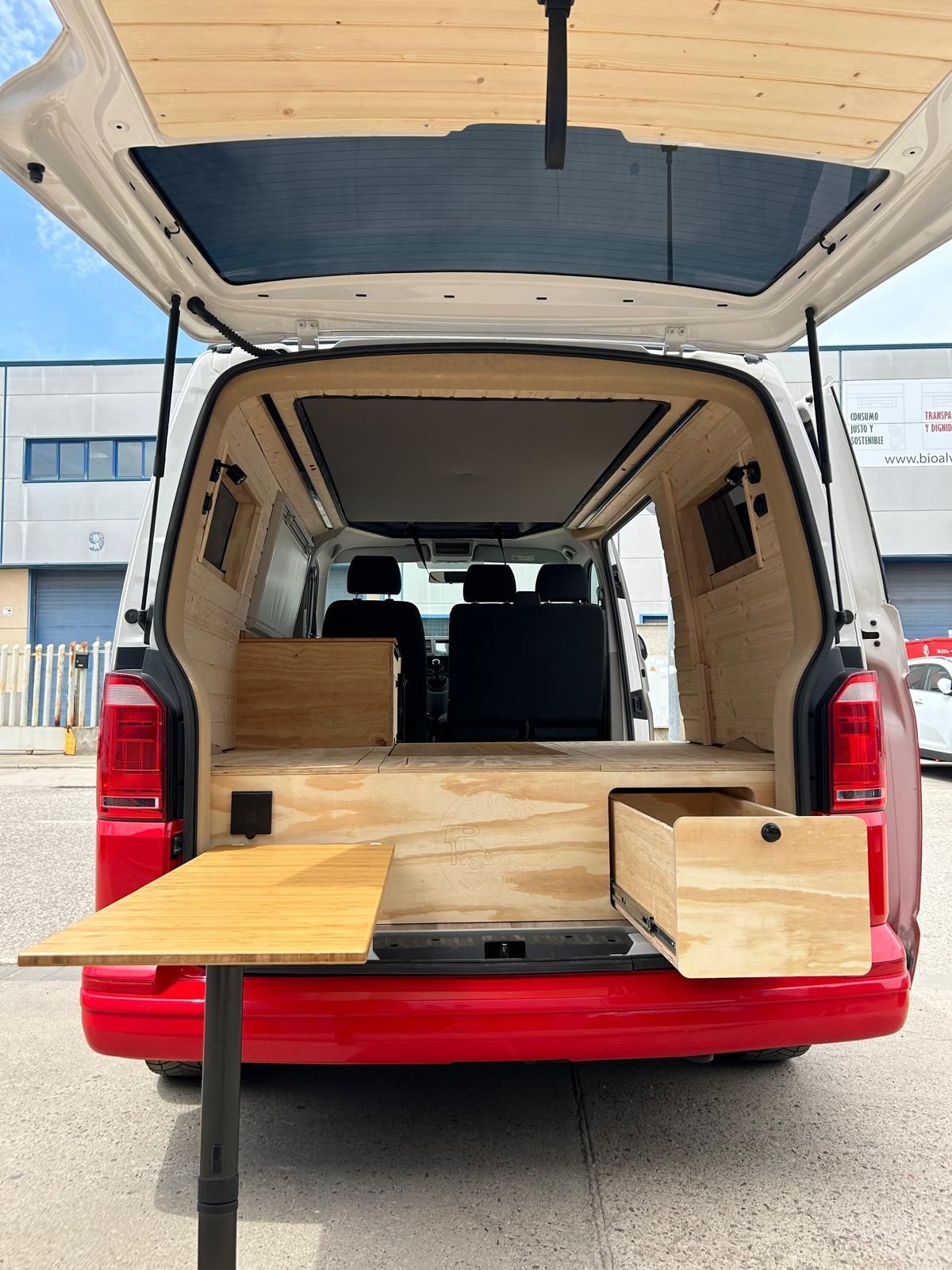 Volkswagen T6. 3 plazas homologadas para viajar. Amplio salón cama y techo elevable con cama. Mobiliario de madera contrachapada, encimera y mesa de bambú. Paredes de pino. Nevera compresor 50L, cocina a gas y fregadero. Mesa con brazo articulado y desmontable con diferentes lugares de emplazamiento. Iluminación led y distintos puntos de luz específicos. Ducha exterior. Totalmente aislada. Autonomía eléctrica con segunda batería con carga motor y placa solar. Gran capacidad de almacenaje con numerosos baúles y cajones.